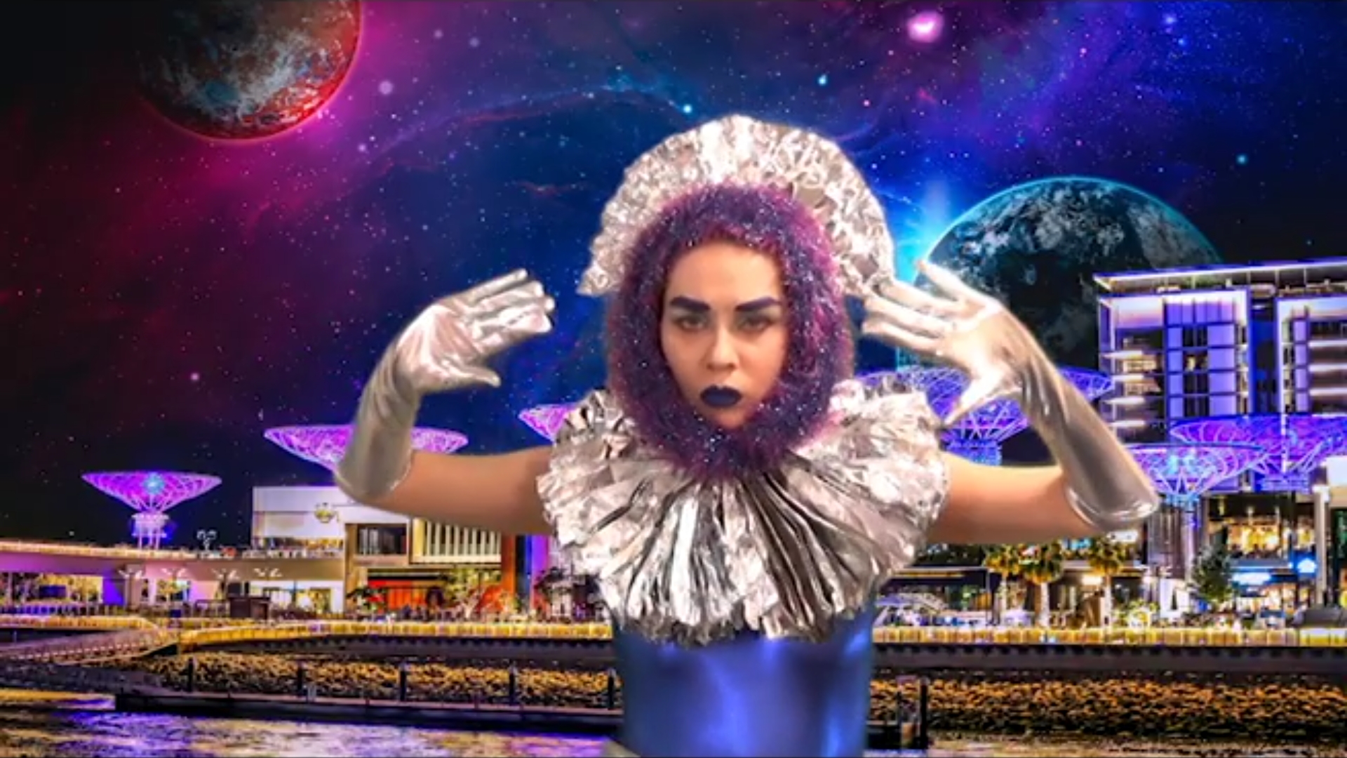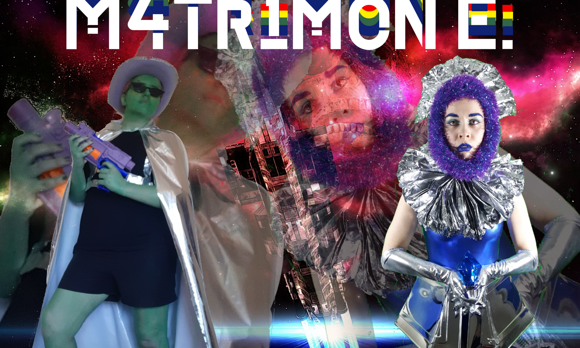 M4Tr1m0N E. is an intergalactic alien celebrity drag wedding. Performed digitally over zoom, the piece pushes the concept of a wedding far beyond the asteroid belt, complete with deeply felt vows, truly alien “mouth entertainment”, and karaoke. This partially live, partially pre-recorded interactive performance tries to be as funny, ugly, and beautiful as it can be – all at once.